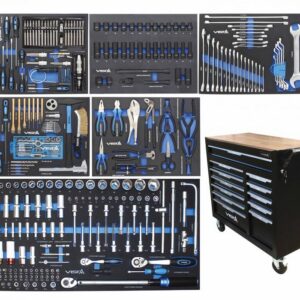 1. sahtel – padrunvõtmete ja momentvõtme komplekt (122 osa) x. 1/4″ ja 1/2″ padrunvõtmed ja otsikud x. Momentvõti: 20–210 Nm x. E-TORX, XZN, TORX, HEX otsikud x. L-kujulised võtmed ja liigendühendused 2. sahtel – kruvikeerajad, bittide komplekt, kaablitester (117 osa) x.L-kujulised HEX ja TORX võtmed x. Löögikruvikeerajad x. Bittide ja adapterite komplekt x. Magnetiline haaraja ja kaablitester 3. sahtel – löökpadrunite komplekt (34 osa) x. Lühikesed ja pikad 1/2″ löökpadrunid x. Pikendused ja liigend 4. sahtel – võtmete komplekt (32 osa) x. Kombinatsioonvõtmed, piduritoru võtmed x. E-TORX võtmed x. Tensioneri ja nihkvõtmed 5. sahtel – lisatarvikute komplekt (42 osa) x.Metalliviilid, haamer, peitlid x.M3–M12 keermestustööriistad x. Mõõdulint, puurid, kruvikeerajad x. Stud extractor 8.5–19 mm 6. sahtel – käsitööriistade komplekt (14 osa) x.Erinevad tangid, reguleeritav mutrivõti x. Kaablisidemete tangid, käärid x. Seegeritangid (sirged ja painutatud)